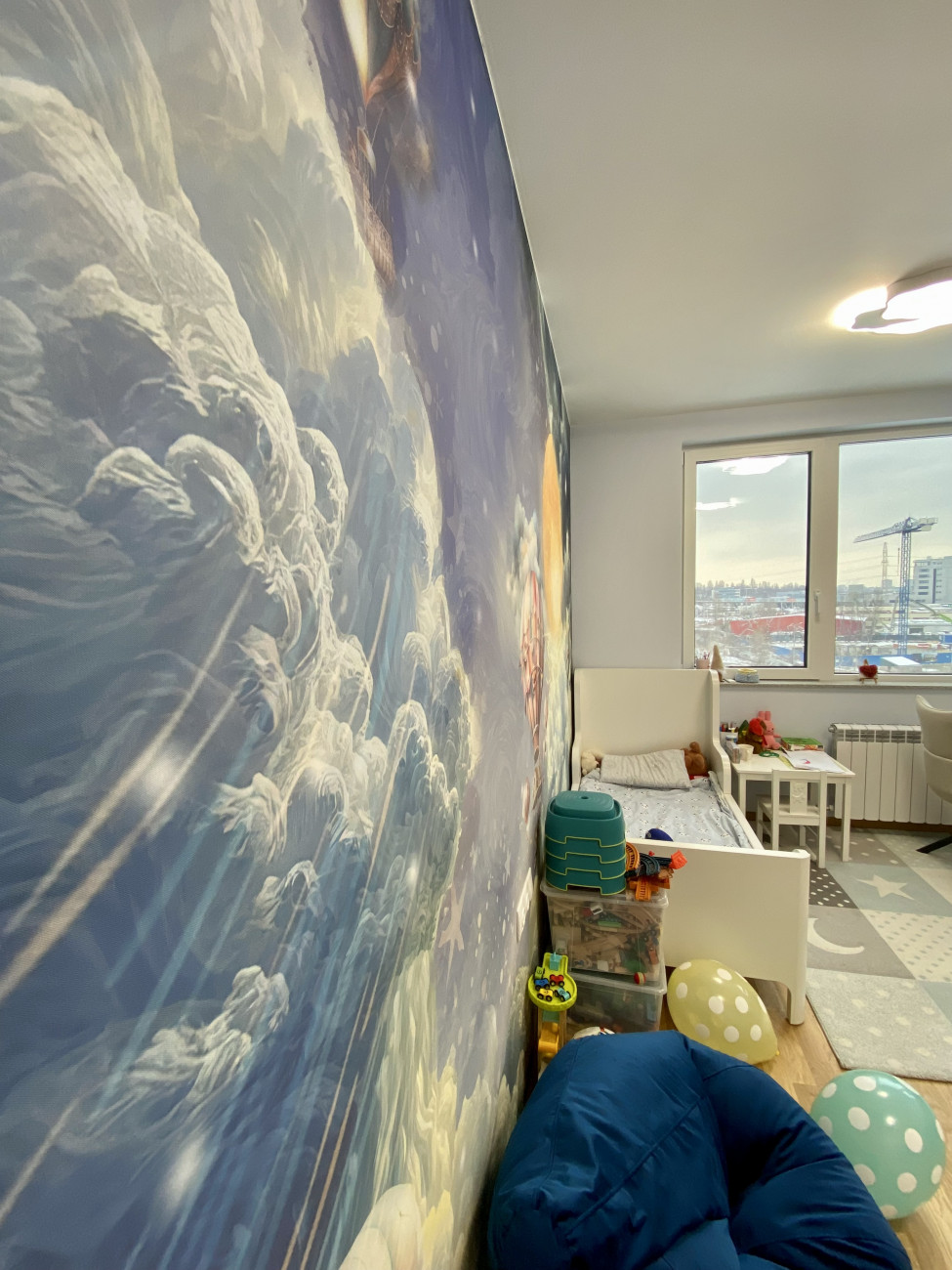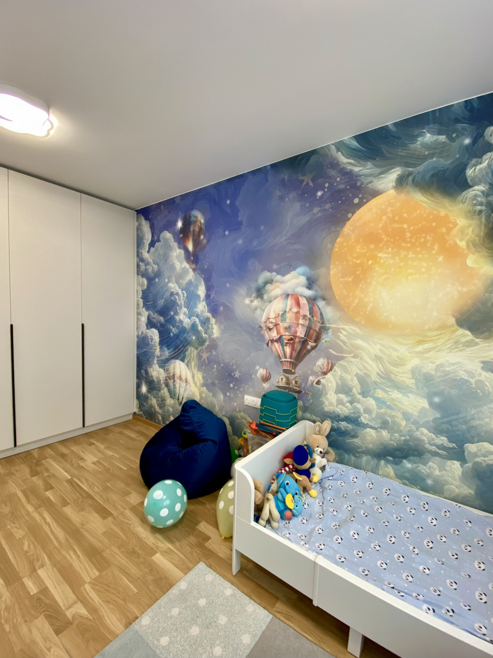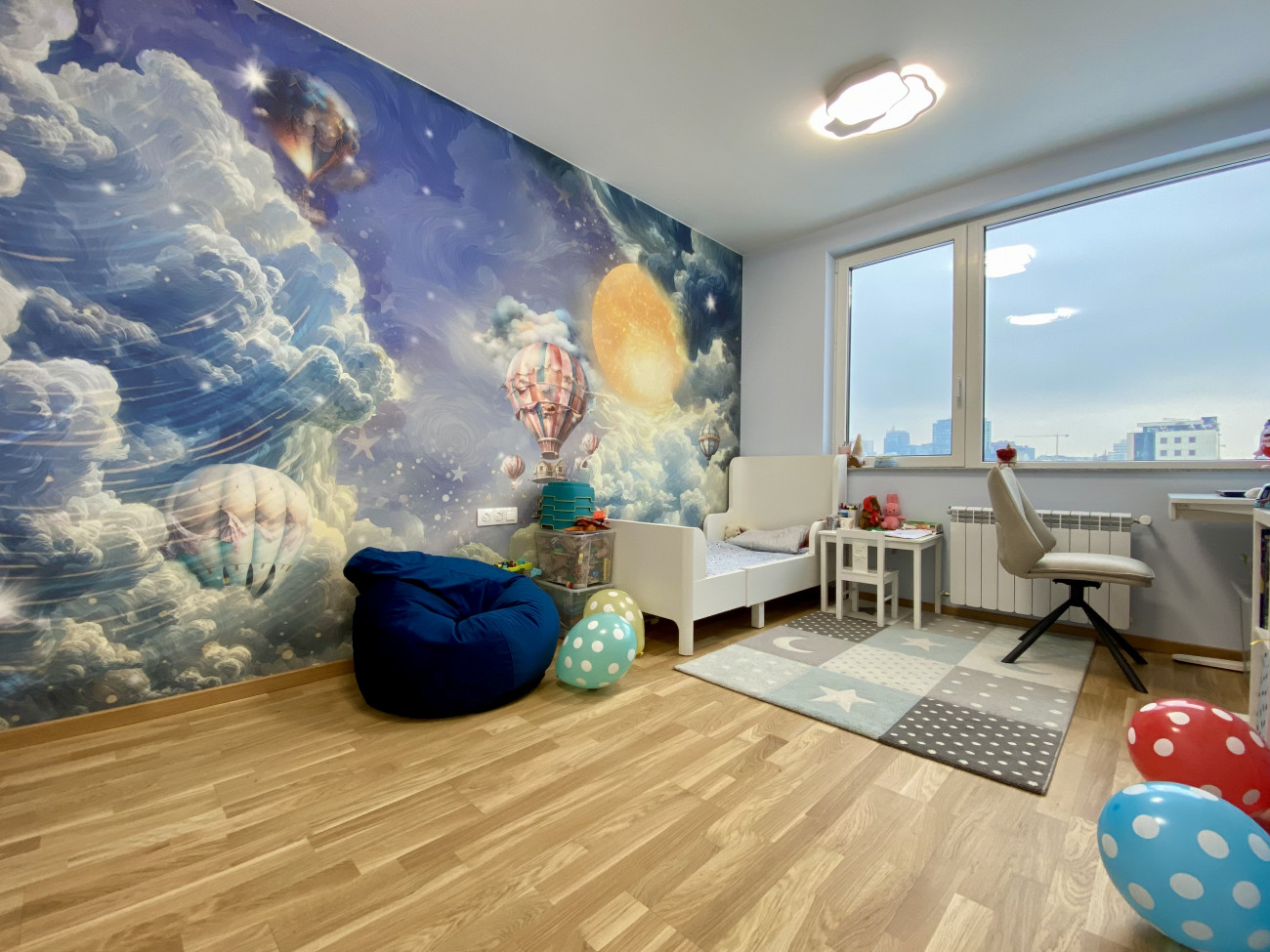 Истински акцент в проекта е детската стая – зона, изпълнена с живот и настроение. Ефектният тапет добавя индивидуалност и характер, превръщайки помещението в любимо място за игра, вдъхновение и растеж.