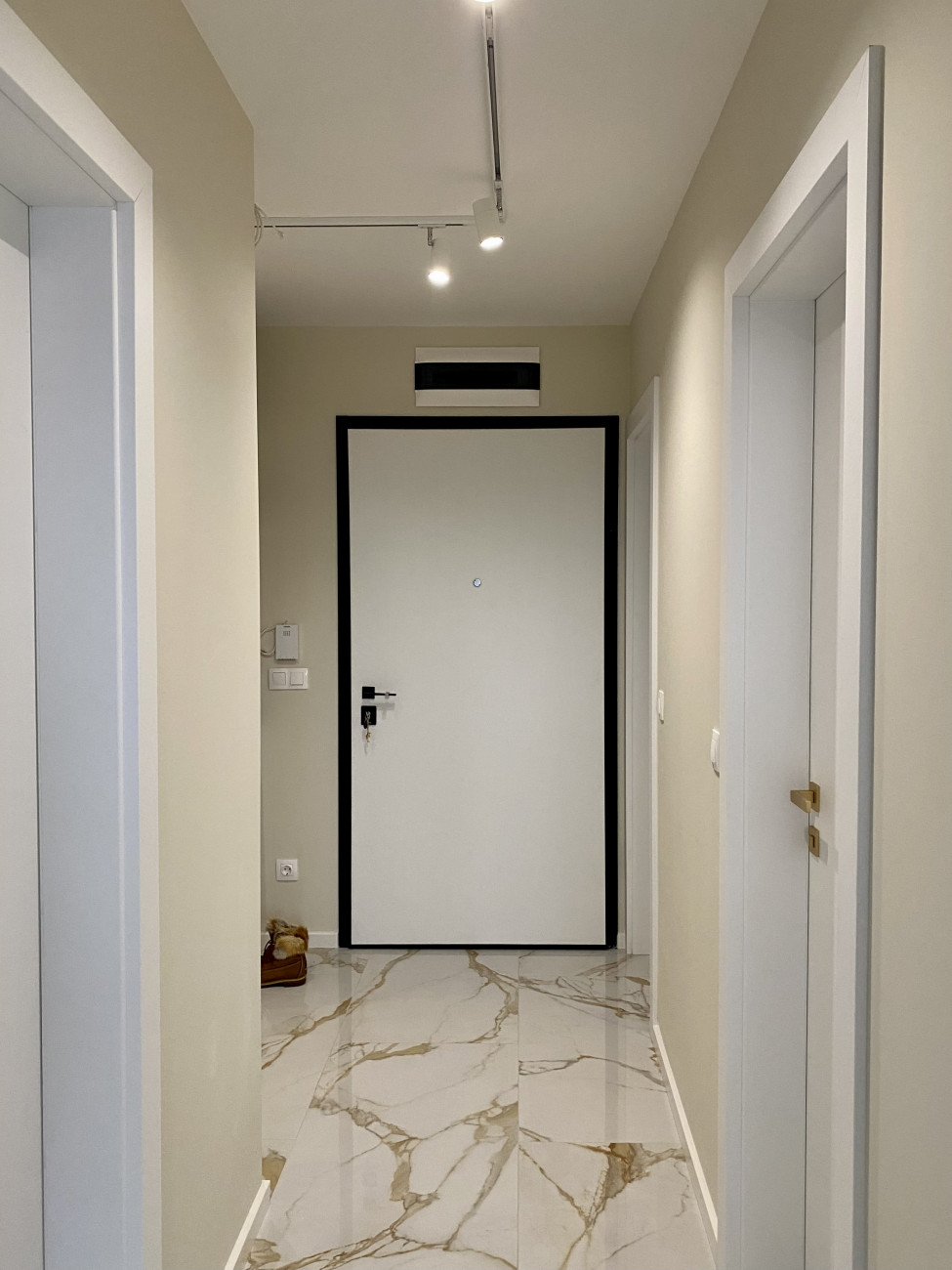 Стените на жилището бяха освежени с висококачествен латекс, който придава простор и светлина на всяка стая. Подовете, изпълнени с гранитогрес, добавят стилна и издръжлива основа, която обединява помещенията и носи усещане за завършеност.