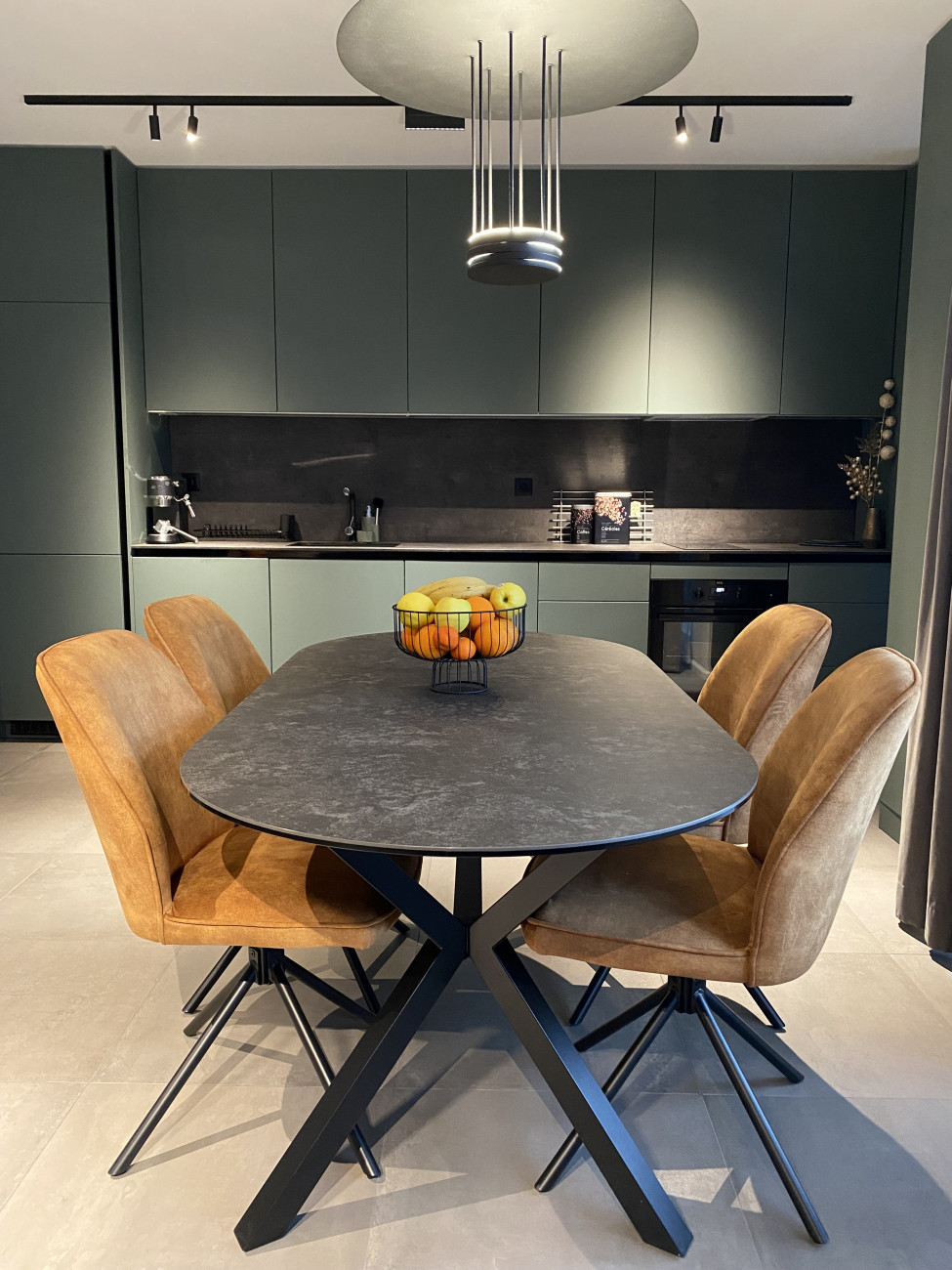 В хола и кухнята, които споделят отворен план, използвахме съвременни материали и цветови схеми, за да създадем усещане за уют. Осветлението играе ключова роля в този проект, като акцентният полилей над трапезарията придава допълнителен чар на интериора и създава фокусна точка.