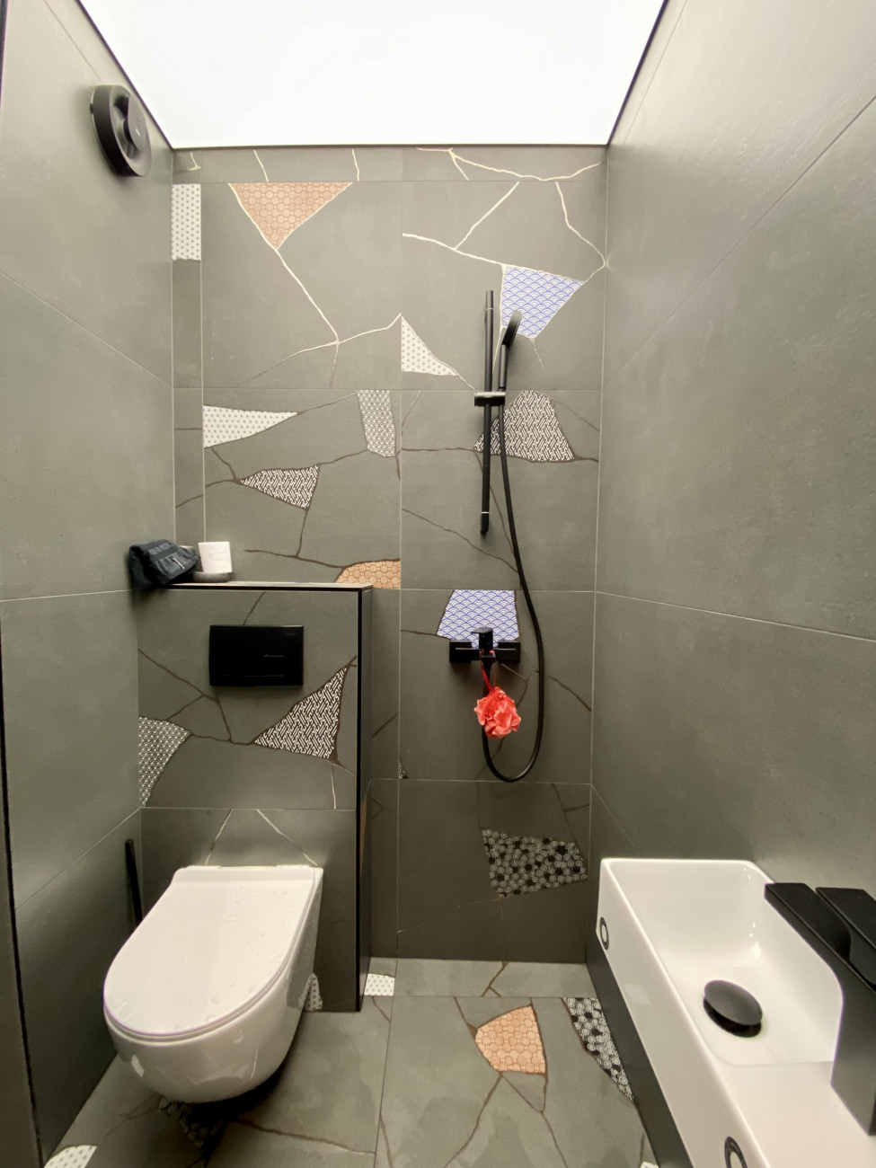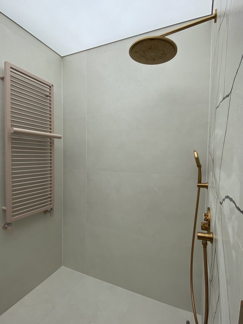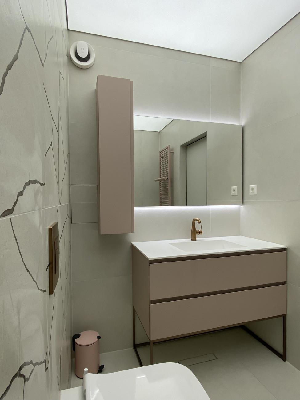 В банята заложихме на висококачествени плочки с изчистен дизайн и фина текстура. Настилките са не само естетически издържани, но и изключително издръжливи на влага и ежедневна употреба. Внимателно подбраните цветови тонове допълват усещането за чистота и модерност, докато скритото LED осветление добавя нежна атмосфера и подчертава елегантността на пространството.